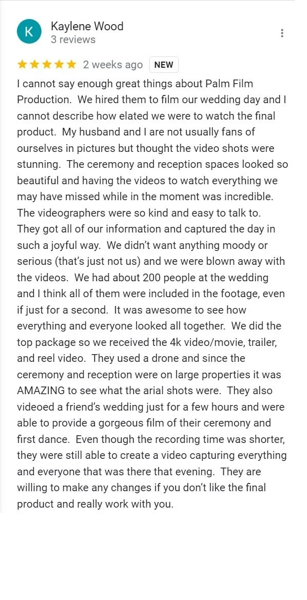 Wow!! What an amazing team to work with. I worked with Palm Film for my wedding on 04.05.2025. From the beginning each team member reached out to me on my vision and were able to guide me on how we could execute my vision for my wedding day! Palm Film was very professional and had such great ideas for our wedding films. There packages are economical and AMAZING in quality- my family and my husband and I were blown away. They were such a pleasure to work with, I would recommend this team to my closest family and friends. This is your sign to book Palm Film for your Big Day!